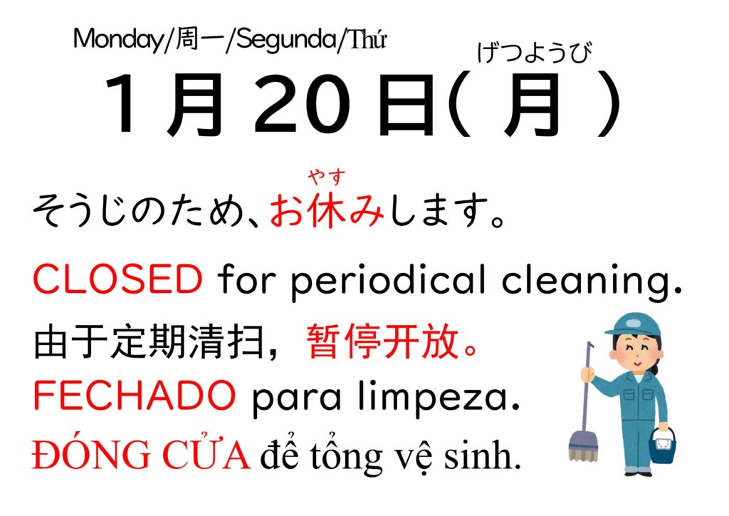 1月20日(月:げつようび)コミュニケーションコーナーは、休(やす)みです。