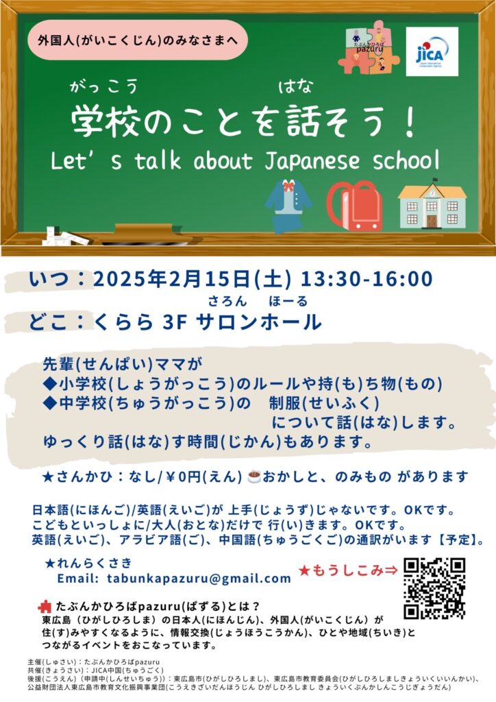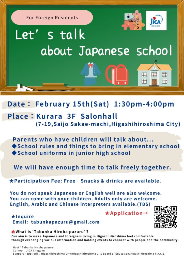 ”学校(がっこう)のことを話(はな)そう“というイベントがあります。外国人(がいこくじん)の先輩(せんぱい)ママが日本(にほん)の小学校(しょうがっこう)や中学校(ちゅうがっこう)のことを話(はな)します。無料(むりょう)で参加(さんか)できます。英語(えいご)、アラビア語(ご)、中国語(ちゅうごくご)の通訳(つうやく)があります。