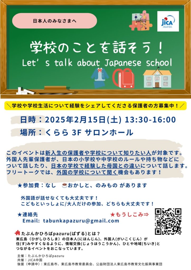 *日本人の方で学校生活について経験をシェアしてくださる保護者の方募集しています。日本語のチラシを見てください。