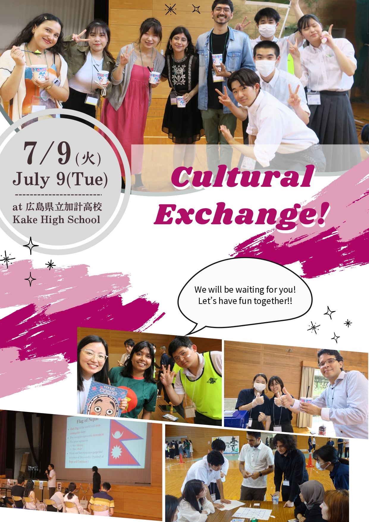 7 月 9 日(星期二) 9:45 ~15:10,将在加计高中举办留学生与加计高中生之间的文化交流活动。活动免费。提供接送服务。详情请见下面的申请表。