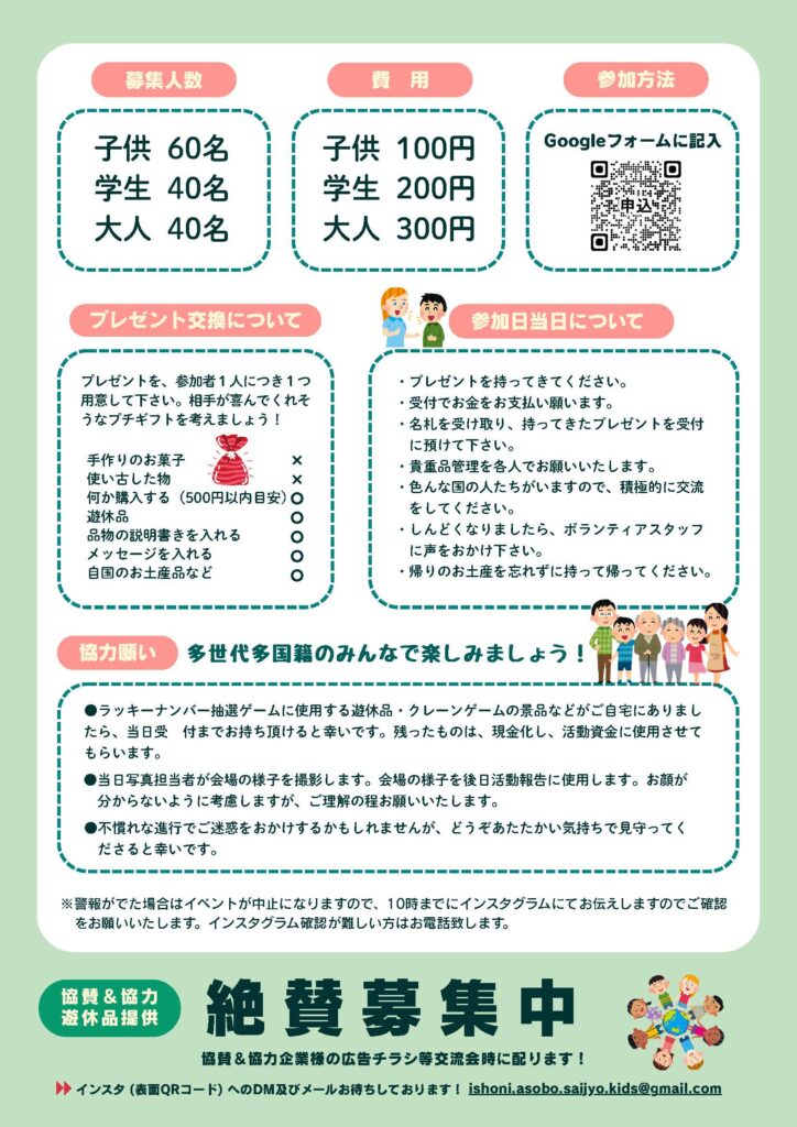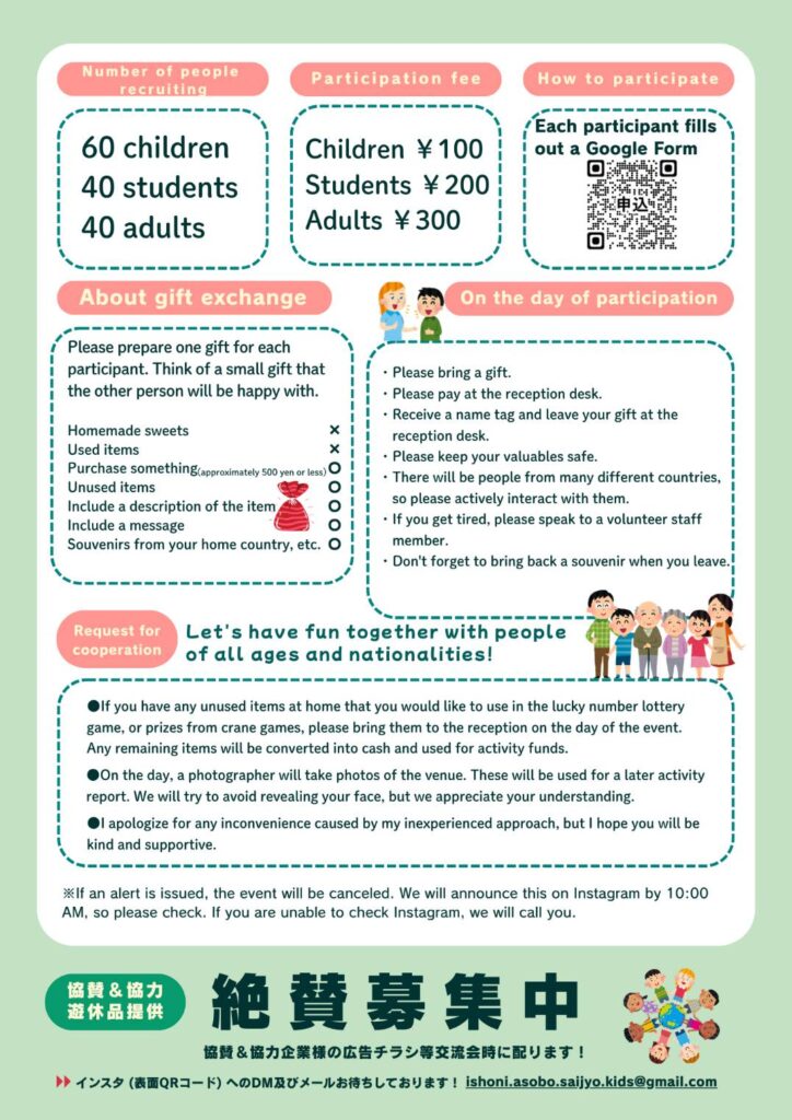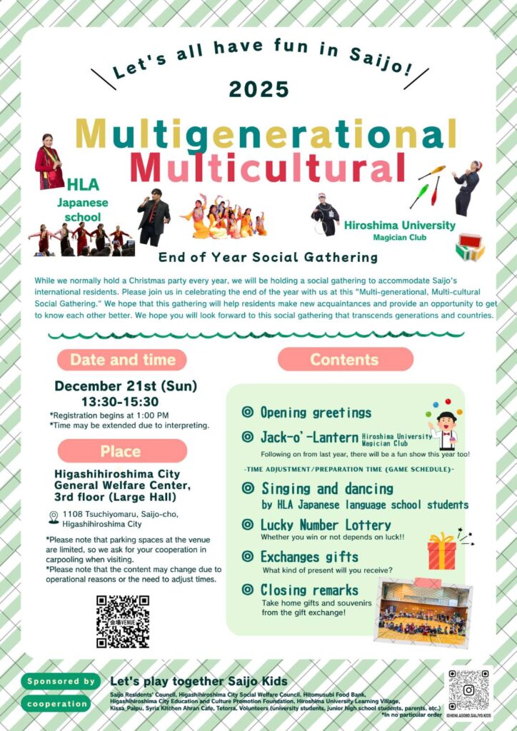12月21日日曜(にちよう)、13:30~15:30、東広島市総合福祉(ひがしひろしましそうごうふくし)センター 3階(かい)、大(だい)ホールで、いろいろな ねんれいの人(ひと)、いろいろな 国(くに)の 人(ひと)と 年末(ねんまつ)の 交流会(こうりゅうかい)を します。大人(おとな)¥300、学生(がくせい)¥200、こども¥100です。プレゼント交換(こうかん)も します。参加(さんか)したい 人(ひと)は、申込(もうしこみ)を してください。もっと 知(し)りたい 人(ひと)は、チラシを みてください。