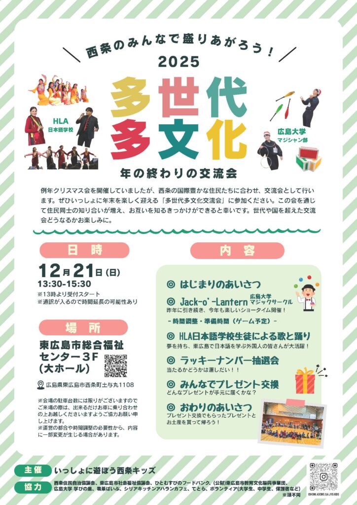 On Sunday, December 21, from 1:30 PM to 3:30 PM, there will be a year-end exchange event with people of various ages and from various countries at the Higashihiroshima City General Welfare Center, 3rd Floor, Large Hall. The participation fee is ¥300 for adults, ¥200 for students, and ¥100 for children.