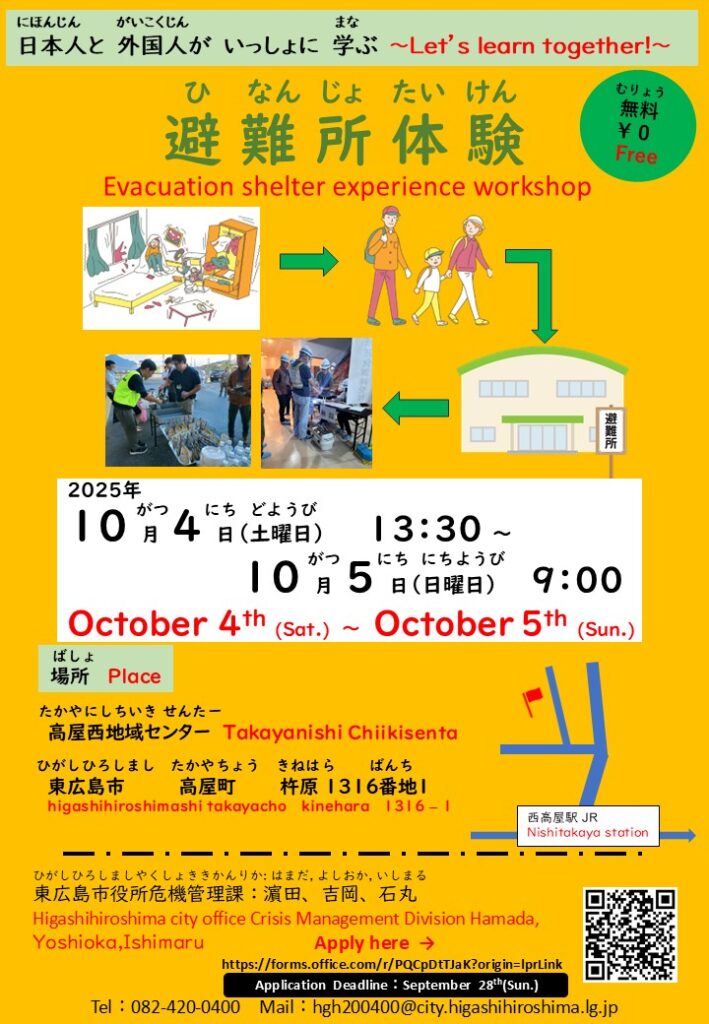 On Saturday, October 4th from 13:30, there will be an Evacuation Shelter Experience Workshop at the Takayanishi Chiiki (Community) Center.