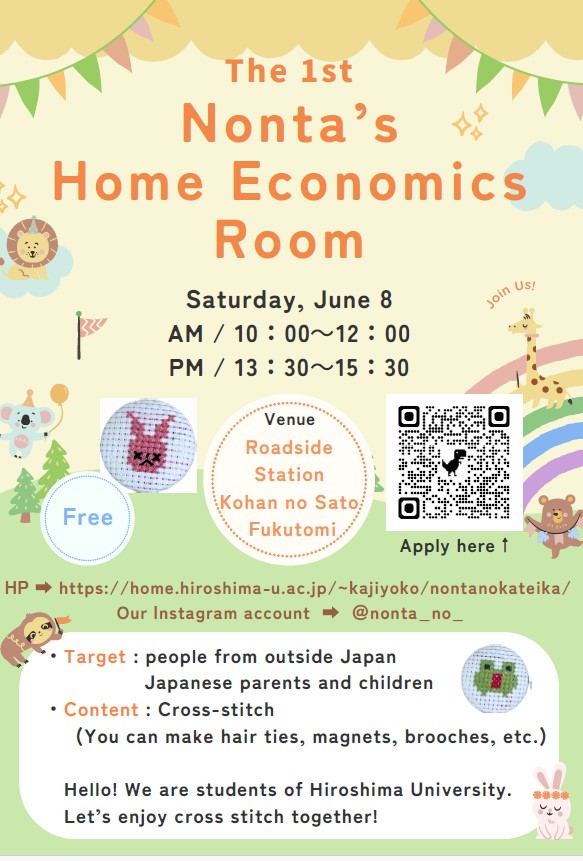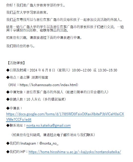 广岛大学的学生们正在招募外国人可以参加的名为 "Nonta 家政科室 "的活动。活动内容为与日本人家庭一起制作饰品。 更多信息,请参阅传单。