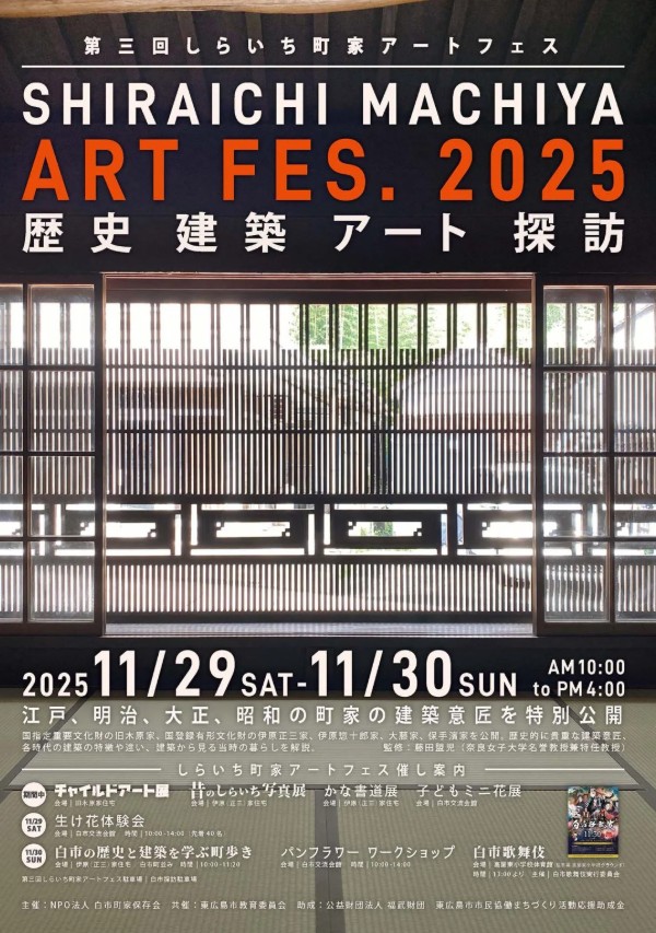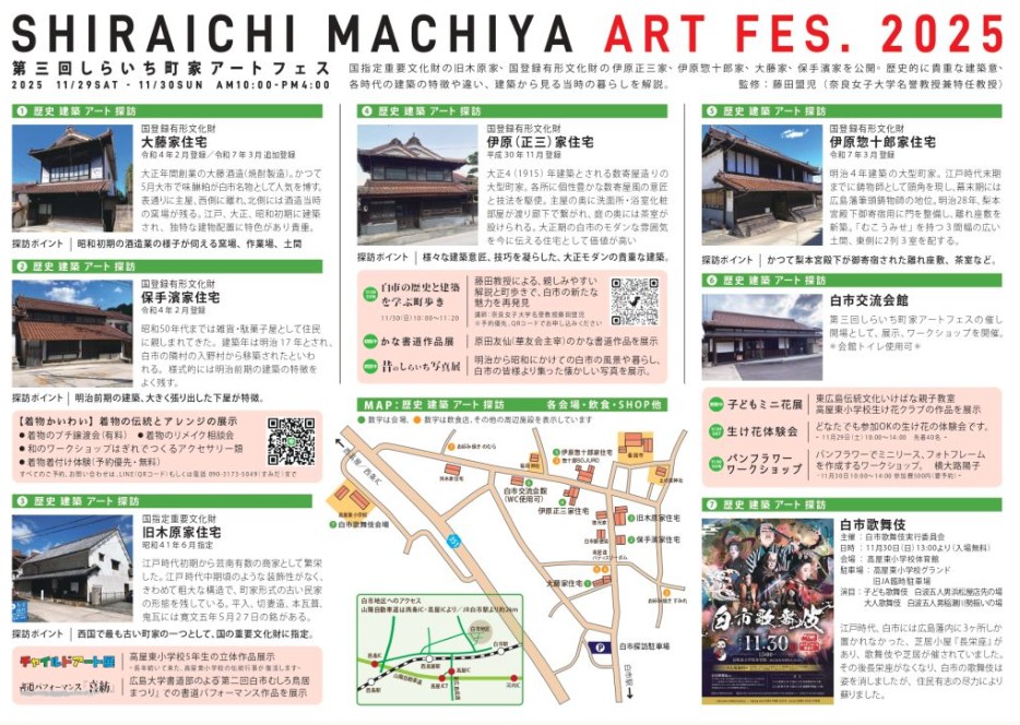 - “Shiraichi Machiya Art Festival”: On the 29th and 30th, from 10:00 to 16:00, you can explore the interior of a traditional house in Shiraichi. There will also be exhibitions of photography and calligraphy.