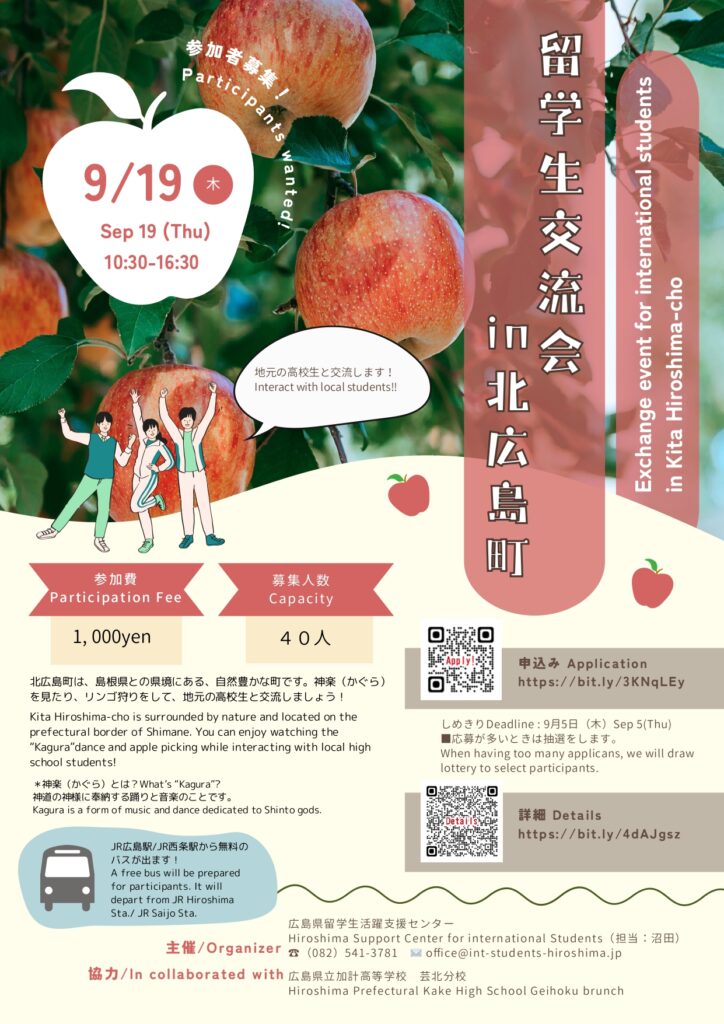9月19日(木もくようび)10:30~16:30、北広島町(きたひろしまちょう)で 留学生(りゅうがくせい)交流会(こうりゅうかい)があります。神楽(かぐら)を 見(み)たり、リンゴ狩(が)り をします。地元(じもと)の高校生(こうこうせい)と 交流(こうりゅう)します。申込(もうしこみ)締切(しめきり)は 9月5日(木もくようび)です。もっと知(し)りたい人(ひと)は 次(つぎ)のリンクを 見(み)てください。