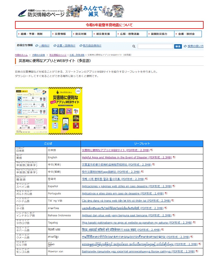 Nhật Bản là quốc gia thường xuyên xảy ra động đất. Bên cạnh đó cũng có nhiều cơn bão và mưa lớn. Những hiện tượng này được gọi là thảm họa. Chính phủ Nhật Bản đã tạo ra tờ rơi tổng hợp các app, trang web tiện lợi khi xảy ra thảm họa. Có thể xem bằng 15 ngôn ngữ. Chi tiết xin vui lòng tham khảo đường link dưới đây.