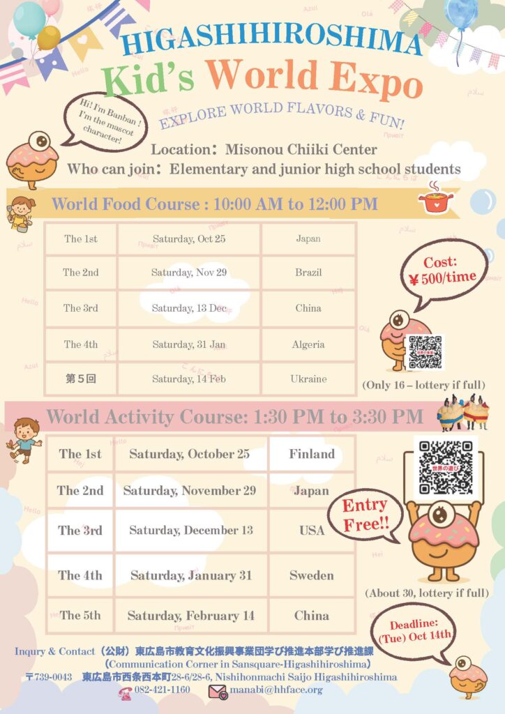 10月~2026年2月まで、毎月(まいつき)1回(かい)、全(ぜん)5回(かい)、「東広島(ひがしひろしま) こどもミニ万博(ばんぱく)」が あります。小学生(しょうがくせい)・中学生(ちゅうがくせい)が 参加(さんか) できる イベントです。