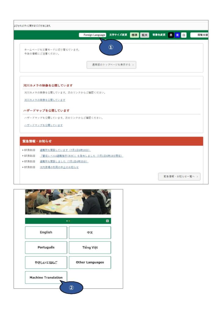 当发生暴雨、台风或地震等灾害预警时,东广岛市的主页会切换到灾害模式。 还会提供有关避难场所等信息。 使用自动翻译功能,可以查看英语、中文、葡萄牙语、越南语和韩语的信息。 请按图示进行操作。https://www.city.higashihiroshima.lg.jp/