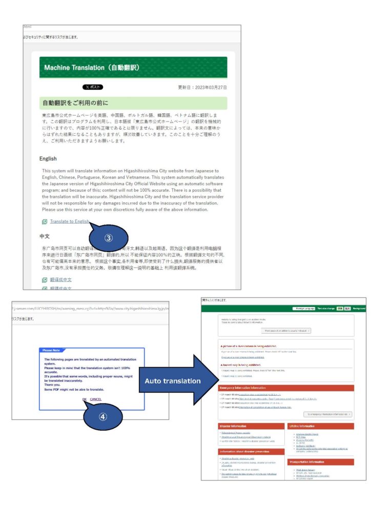 When heavy rain, typhoon, or earthquake occurs and a warning is issued, the Higashihiroshima city website will change to disaster mode. Information on evacuation centers will also be posted. Information can be viewed in English, Chinese, Portuguese, Vietnamese, and Korean using the automatic translation function. Please follow the steps in the image.https://www.city.higashihiroshima.lg.jp/