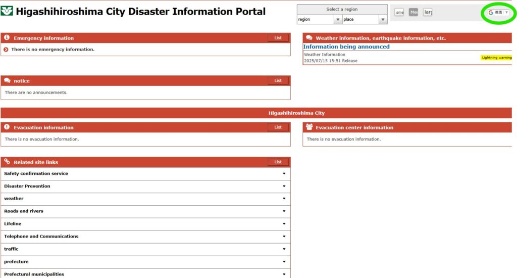 Sau đó, nếu click vào "DISASTER INFORMATION" (Thông tin thảm họa) sẽ có thể vào được Cổng thông tin về thảm họa của thành phố Higashihiroshima. Từ phía trên bên phải, có thể chọn lựa ngôn ngữ và xem thông tin về khí tượng, động đất, nơi lánh nạn,…