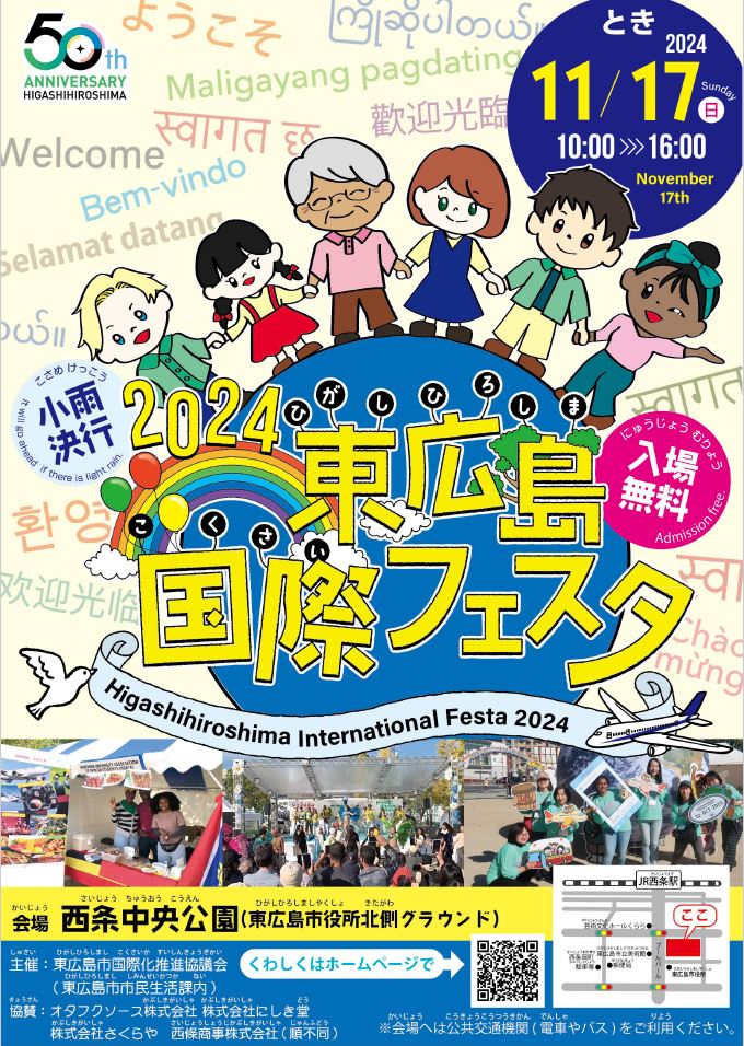 东广岛国际节将于 11 月 17 日(星期日)10:00-16:00 在西条中央公园举行。 免费入场。 届时将有来自不同国家的舞台表演、不同国家的美食以及了解各国文化的机会。 如果您想了解更多信息,请访问以下网址。
