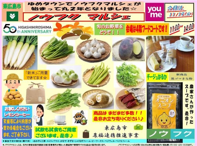 Vào ngày 19/11 (Thứ Ba), từ 11:00-14:00 chợ Noufuku Marche sẽ diễn ra tại tầng 4 Youme town Higashihiroshima.Tại đây sẽ bày bán các loại rau củ, đồ ăn và nhiều mặt hàng khác.