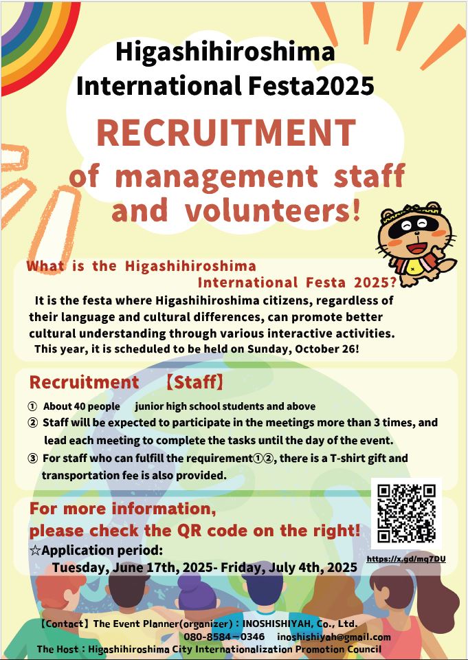 【Higashihiroshima International Festa 2025 Volunteer/Staff Wanted!】【东广岛国际节 2025 志愿者工作人员招募】【Recrutamento de voluntários e funcionários para o Festival Internacional de Higashihiroshima 2025】【Tuyển tình nguyện viên hỗ trợ sự kiện Lễ hội quốc tế Higashihiroshima 2025】【東広島国際(ひがしひろしまこくさい)フェスタ 2025ボランティア・スタッフ募集(ぼしゅう)】