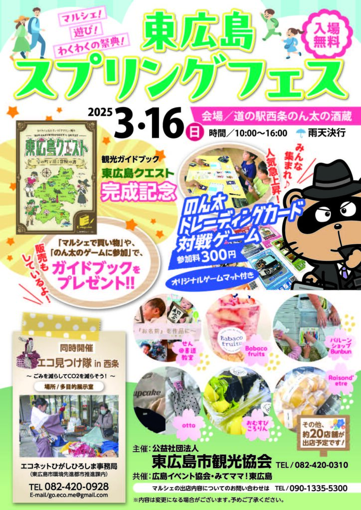3月16日(日にちようび)、道の駅(みちのえき)西条(さいじょう)のん太(た)の酒蔵(さかぐら)で 「東広島(ひがしひろしま)スプリングフェス」が あります。親子(おやこ)で 楽(たの)しめる イベントが たくさんあります。入場料(にゅうじょうりょう)は 無料(むりょう)です。マルシェもあります。もっと知(し)りたい人(ひと)は チラシと URLを チェックしてください。