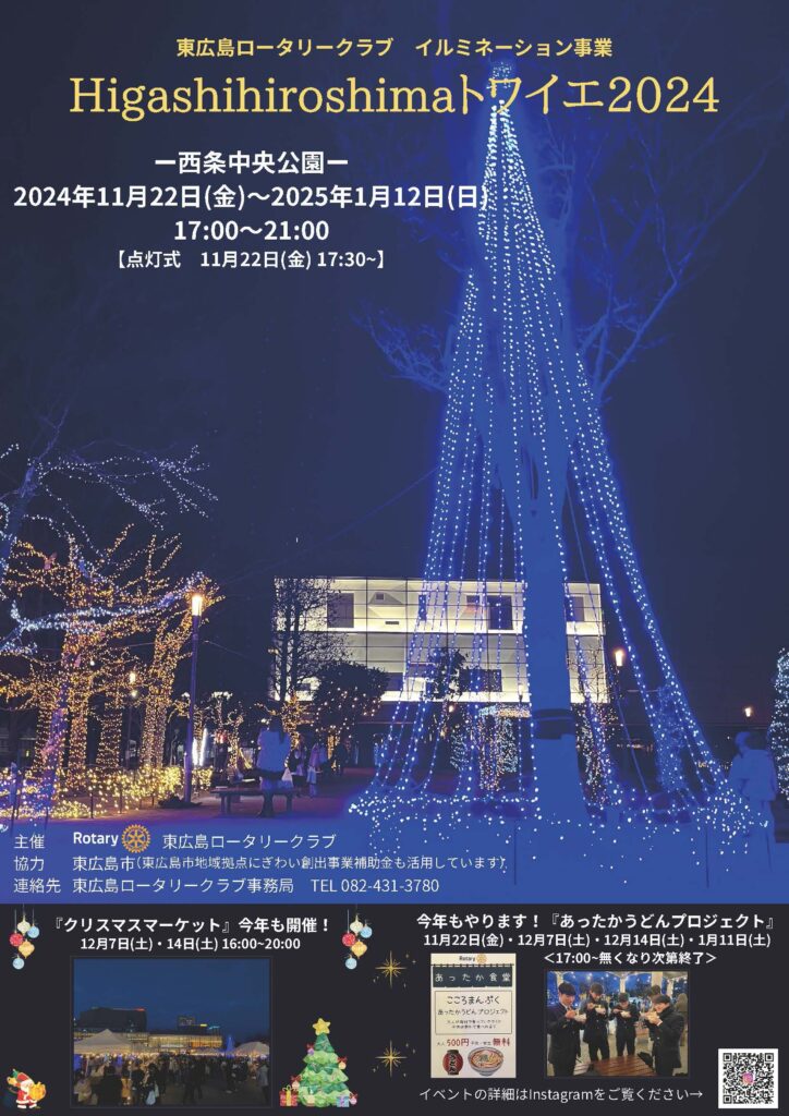 西条中央公園(さいじょうちゅうおうこうえん)(市立美術館前(しりつびじゅつかんまえ))で、イルミネーションによるライトアップ「Higashihiroshima トワイエ 2024」が あります。
