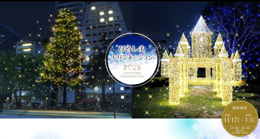 Từ ngày 17/11 (Thứ Hai) đến 3/1/2026 (Thứ Bảy) tại con phố Heiwa-dori của thành phố Hiroshima sẽ diễn ra sự kiện "Hiroshima Dreamination". Hàng ngày trong khoảng thời gian từ 17:30 đến 22:30 bạn có thể ngắm nhìn con phố được thắp sáng bởi những ánh đèn. Để biết thêm thông tin chi tiết, xin vui lòng tham khảo trang web chính thức dưới.