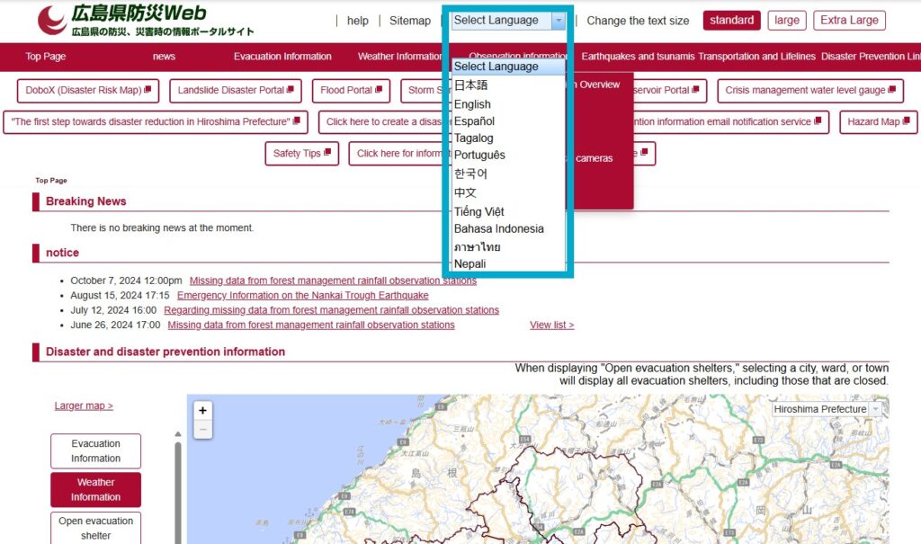 Bạn có thể xem các tin tức về mưa lớn, động đất, sóng thần v.v... bằng nhiều ngôn ngữ khác nhau. Ngoài ra có thể nắm được các thông tin cảnh báo, chú ý và nơi lánh nạn khi có thiên tai xảy ra từ trang web dưới đây: