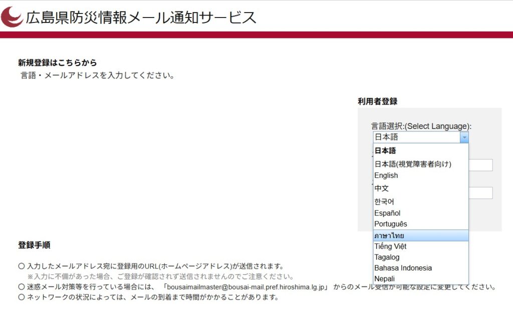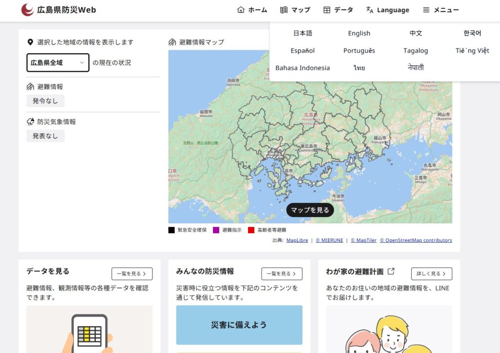 【Hiroshima Prefecture Disaster Prevention Web 】【广岛县防灾WEB & 邮件通知服务】【Serviço de notificação por e-mail e WEB para Prevenção de Desastres da Província de Hiroshima】【Trang web phòng chống thiên tai và dịch vụ thông báo qua mail của tỉnh Hiroshima】【広島県防災(ひろしまけんぼうさい)WEB & メール通知(つうち)サービス】