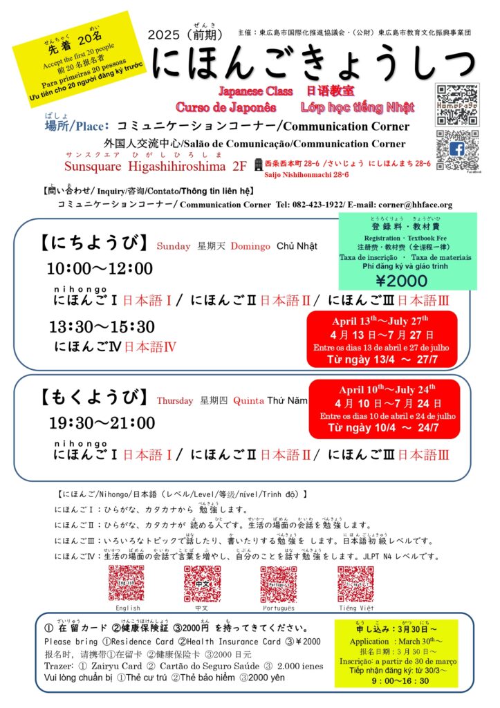 O primeiro período do curso de japonês de 2025 começará em abril. As inscrições começarão no dia 30 de março (domingo). Por favor, compareça ao Salão de Comunicação do Sunsquare entre 9h00 e 16h30 com seu Zairyu Card, cartão de seguro de saúde e 2.000 ienes.