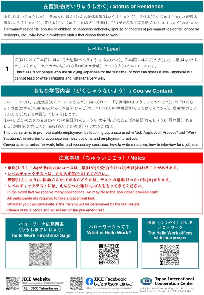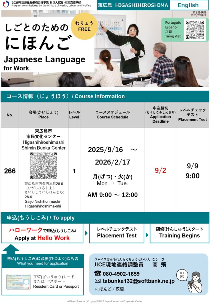 "Lớp tiếng Nhật phục vụ công việc" sẽ khai giảng vào tháng 9. Đây là lớp học trực tiếp trên lớp. Người muốn đăng ký vui lòng đến Hello work. Hạn đăng ký là ngày 2/9. Về thông tin chi tiết, xin vui lòng tham khảo đường link dưới.