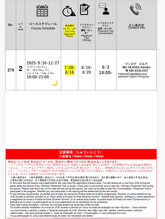 O curso de japonês chamado "Japonês para o Trabalho" começará aulas online em setembro. Para se inscrever, dirija-se ao Hello Work. O período de inscrição vai de 28 de julho a 18 de agosto. Para saber mais, clique no seguinte URL.