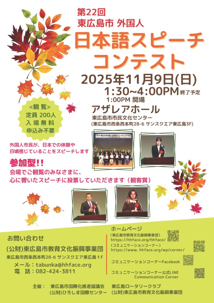 This coming Sunday November 9th, from 13:30 to 16:00, a Japanese speech contest will be held at Azalea Hall on the 3rd floor of Sunsquare Higashihiroshima.
