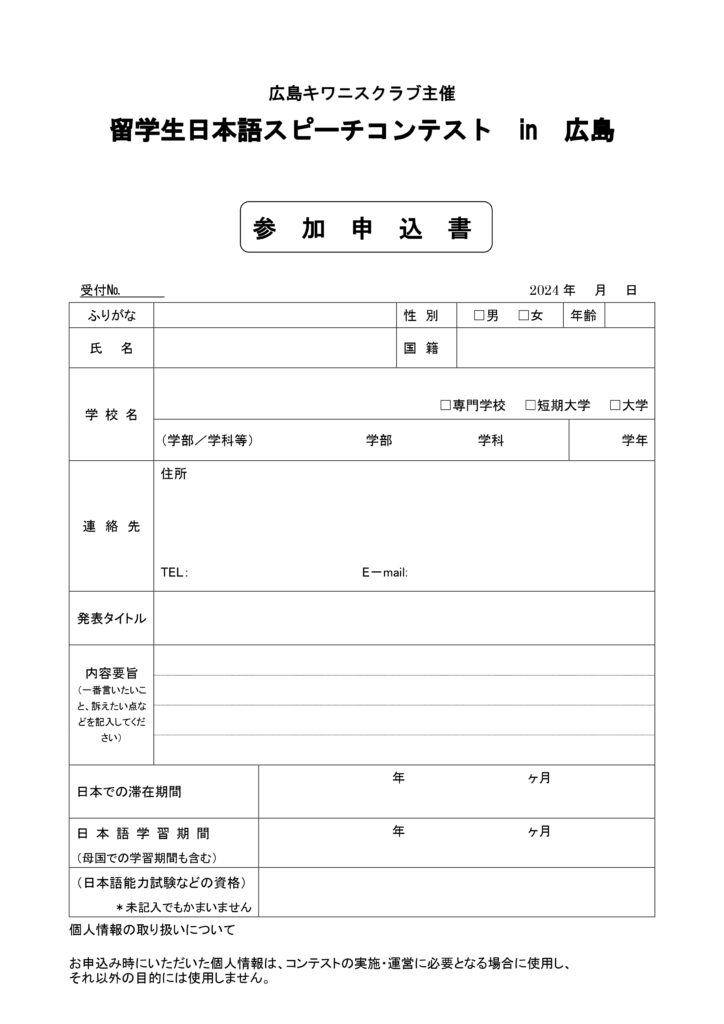 The Japanese Speech Contest for International Students in Hiroshima 2024 will be held on Saturday, July 27, from 14:10 to 16:10. The contest is open to international students from vocational schools, junior colleges, universities, and graduate schools in Hiroshima Prefecture. Applications are due by Monday, July 1. If you are interested, please visit the following URL: http://www.hiroshimakiwanis.org/active/index.html