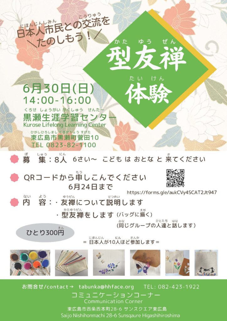 On Sunday, June 30, from 14:00 to 16:00, you can experience Japanese traditional culture of kata-yuzen (Japanese stencil) at Kurose Lifelong Learning Center. If you are able to go to the venue by yourself and are interested, please apply by June 27. To apply, please click on the URL:https://docs.google.com/forms/d/e/1FAIpQLSfBFo9IgDsAz3mnnhqaR1bce74P1xs1Smo18SLseoWOOGqESw/viewform or QR code.