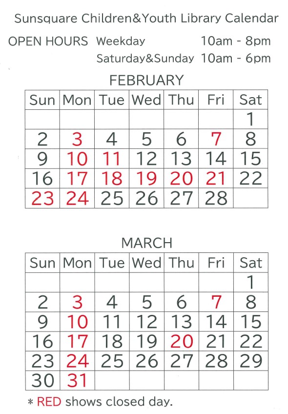 Sunsquare Library will be closed from February 16th (Mon.) to February 21st (Fri.) due to book organization.