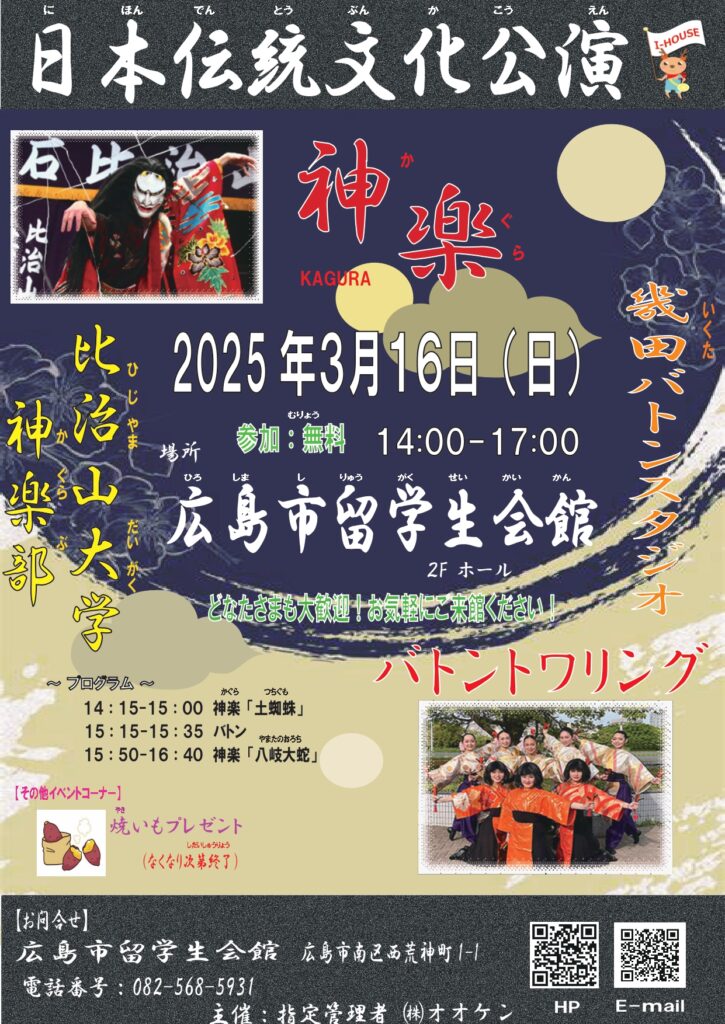 3月16日(日にちようび)14:00~17:00、広島市留学生会館(ひろしましりゅうがくせいかいかん)2Fホールで 日本(にほん)の 伝統文化(でんとうぶんか)、神楽(かぐら)が あります。無料(むりょう)です。来(き)た人(ひと)には 焼き芋(やきいも)の プレゼントがあります。もっと知(し)りたい人(ひと)は チラシを見(み)てください。