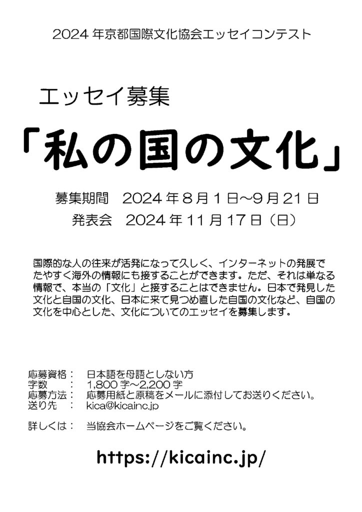 日本(にほん)で見(み)つけた文化(ぶんか)や、日本に来(き)て気付(きづ)いた自分(じぶん)の国(くに)の文化など、自分(じぶん)の国(くに)の文化(ぶんか)を中心(ちゅうしん)とした、 文化(ぶんか)についてのエッセイを募集(ぼしゅう)します。締切(しめきり)は9月21日(土)までです。申込(もうしこみ)など、もっと知(し)りたい人(ひと)は、ホームページを見てください。https://kicainc.jp/