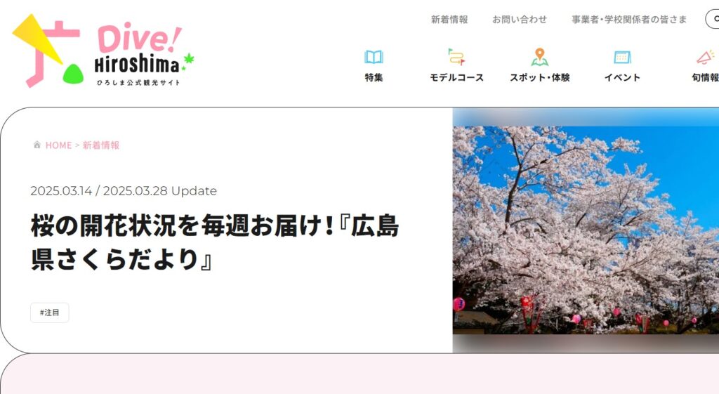 Dive Hiroshima, the official website of Hiroshima Prefecture, has detailed information on cherry blossom viewing and when cherry blossoms bloom.