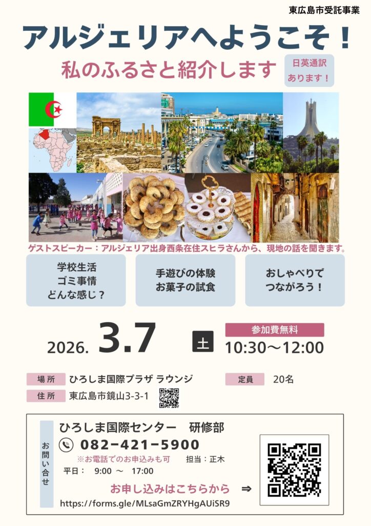 3月7日(土)10:30~12:00に、HIPひろしま国際(こくさい)プラザでアルジェリアの人(ひと)が、アルジェリアの生活(せいかつ)や文化(ぶんか)についてお話(はなし)します。英語(えいご)⇔日本語(にほんご)の通訳(つうやく)付(つ)きです。アルジェリアのお菓子(かし)を食(た)べることも出来(でき)ます。¥0です。申込(もうしこみ)が必要(ひつよう)です。QRコードか、このサイトから 申込(もうしこ)んでください。