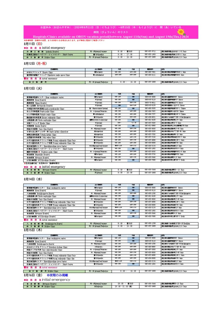 8月11日(日:にちようび)~8月15日(木:もくようび)まで、ほとんどの病院(びょういん)が 休(やす)みになります。これは、開(あ)いている病院(びょういん)のリストです。