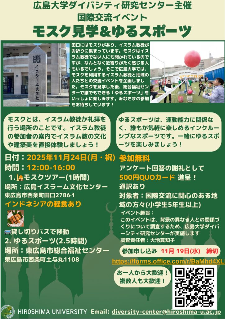 11月24日月曜(げつよう)・祝日(しゅくじつ/やすみのひ)、12:00~16:00、国際交流(こくさいこうりゅう)イベントが あります。イスラム教徒(きょうと)が お祈(いの)りを する 場所(ばしょ)の モスクを 見学(けんがく) します。その後(あと)、みんなで 簡単(かんたん)な スポーツを します。インドネシアの スナックも あります。参加(さんか)は、 無料(むりょう)¥0です。でも、申込(もうしこみ)が いります。締切(しめきり)は、11月19日水曜(すいよう)まで です。もっと 知(し)りたい 人(ひと)は、チラシを みて ください。
