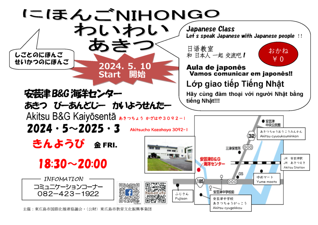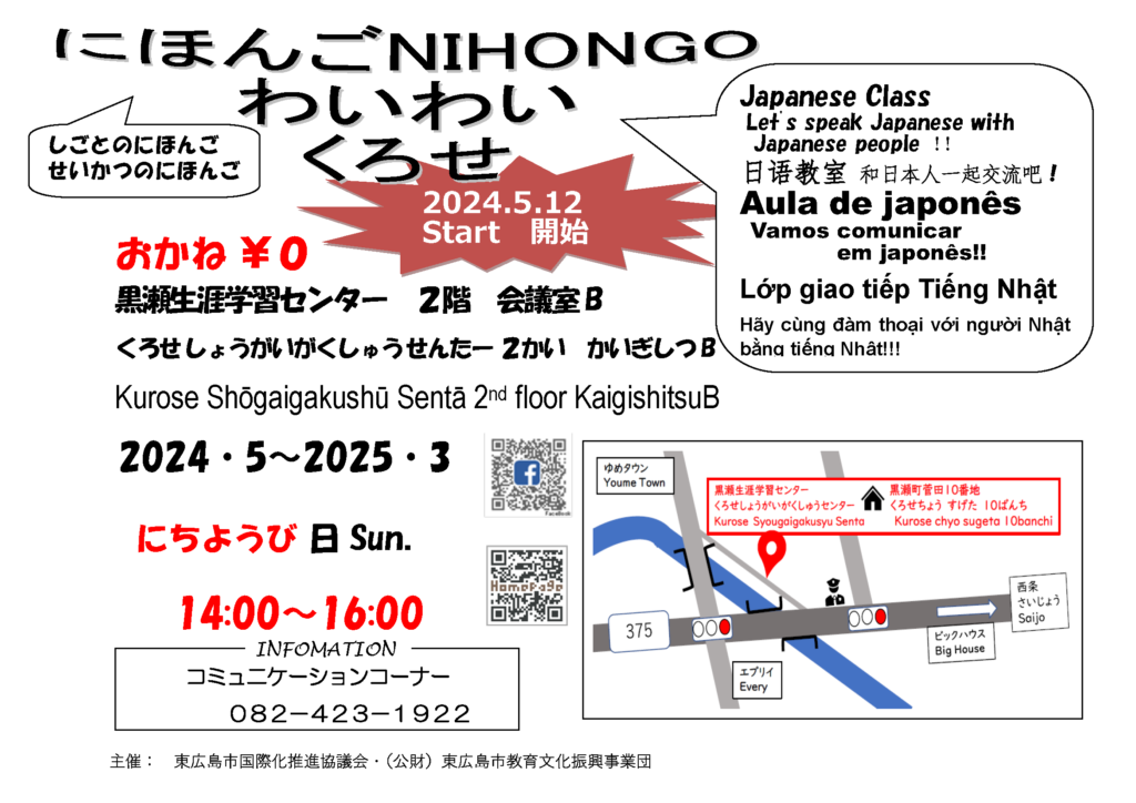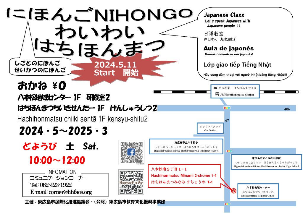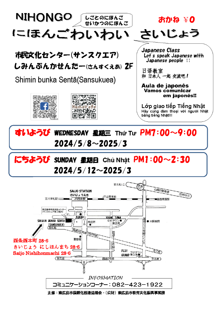 Japanese conversation class "Nihongo WaiWai 2024" will start this week at Saijo, Hachihonmatsu, Kurose and Akitsu. Tuition free. No applications needed. For details including class schedule, please visit our webpage.