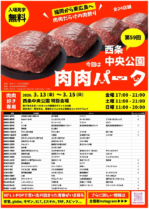 西条中央公园将举办“肉类美食节”活动。现场将汇集各式各样的肉类料理。将有来自广岛 Prefecture和福冈 Prefecture餐厅等共24家店铺的肉类美食,欢迎您前来品尝。