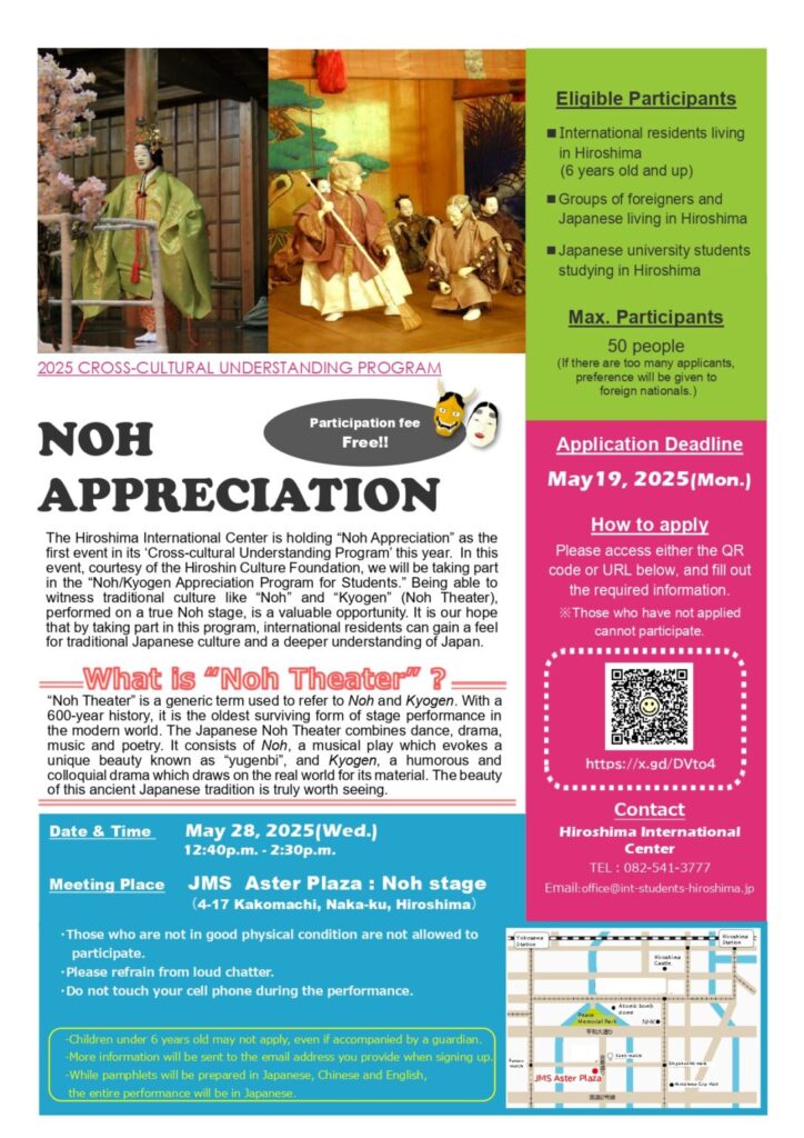 Ngày 28/5 (Thứ Tư), từ 12:40-14:30, tại JMS Aster Plaza, thành phố Hiroshima sẽ tổ chức sự kiện thưởng thức kịch Noh, một loại hình nghệ thuật truyền thống của Nhật Bản. Đối tượng có thể đăng ký tham gia là người nước ngoài đang sinh sống tại tỉnh Hiroshima (ngoại trừ người chưa đủ 6 tuổi), các nhóm bao gồm người nước ngoài và người Nhật đang sinh sống tại tỉnh Hiroshima, học sinh người Nhật đang theo học tại các trường đại học,… trong tỉnh Hiroshima. Miễn phí tham gia. Hạn đăng ký là ngày 19/5. Thông tin chi tiết xin vui lòng tham khảo đường link dưới đây.