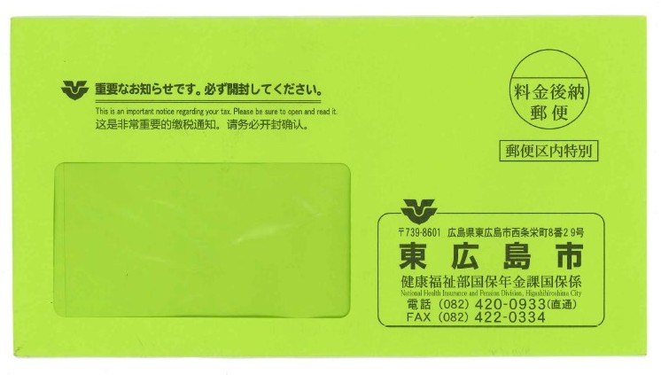国民健康保健税(こくみんけんこうほけんぜい)が いくらになるか 計算(けいさん)するために、 所得申告(しょとく しんこく)が必要(ひつよう)な人(ひと)がいます。その人(ひと)たちの所(ところ)に、2月(にがつ)中旬(ちゅうじゅん)までに申告(しんこく)の書類(しょるい)が郵便(ゆうびん)で届(とど)いています。緑色(みどりいろ)の封筒(ふうとう)です。必(かなら)ず 4月15日(火:かようび)までに市役所(しやくしょ)に送(おく)り返(かえ)してください。