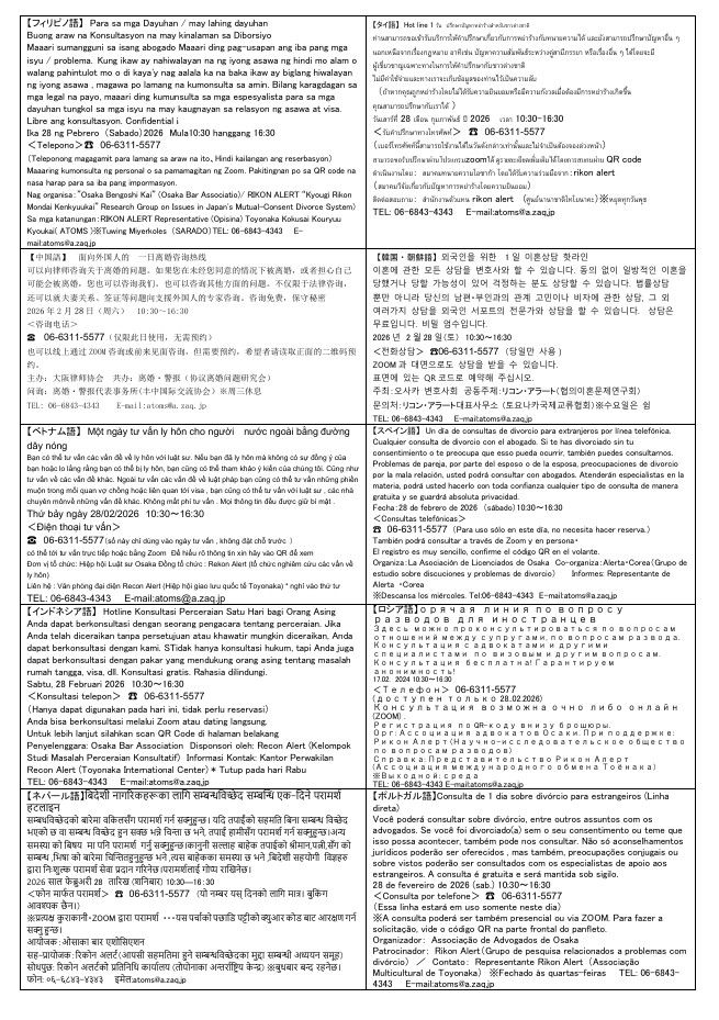 Vào ngày 28/2 (Thứ Bảy), Hội luật sư Osaka sẽ tổ chức buổi tư vấn qua điện thoại về vấn đề ly hôn cho người nước ngoài. Không cần đặt trước. Để biết thêm thông tin chi tiết, xin vui lòng tham khảo trang web chính thức dưới đây.