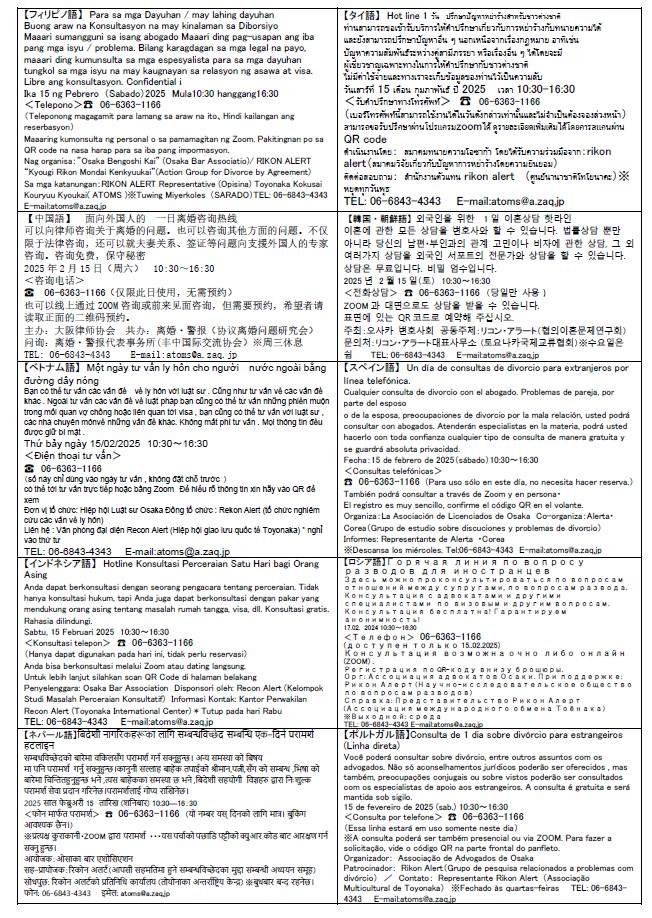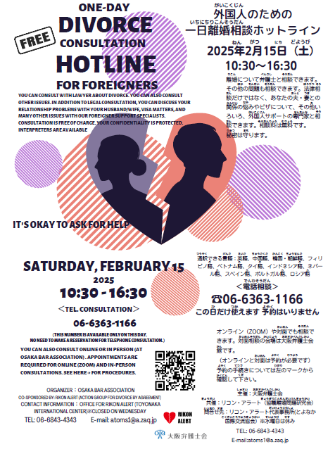 Divorce consultations are available on February 15th (Saturday) from 10:30am to 4:30pm in English, Chinese, Korean, Filipino, Vietnamese, Thai, Indonesian, Nepali, Spanish, Portuguese and Russian for free of charge (\ 0 ).