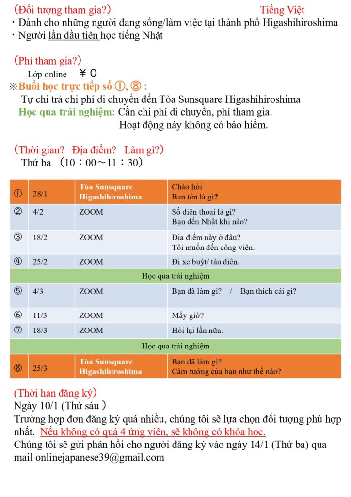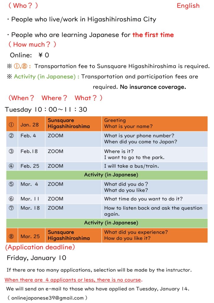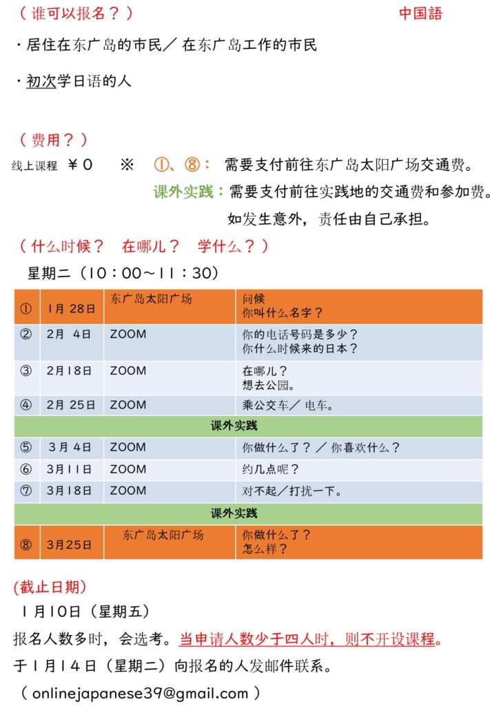 'Online Japanese course connecting to the community' for beginners will start. The deadline is 10 January.