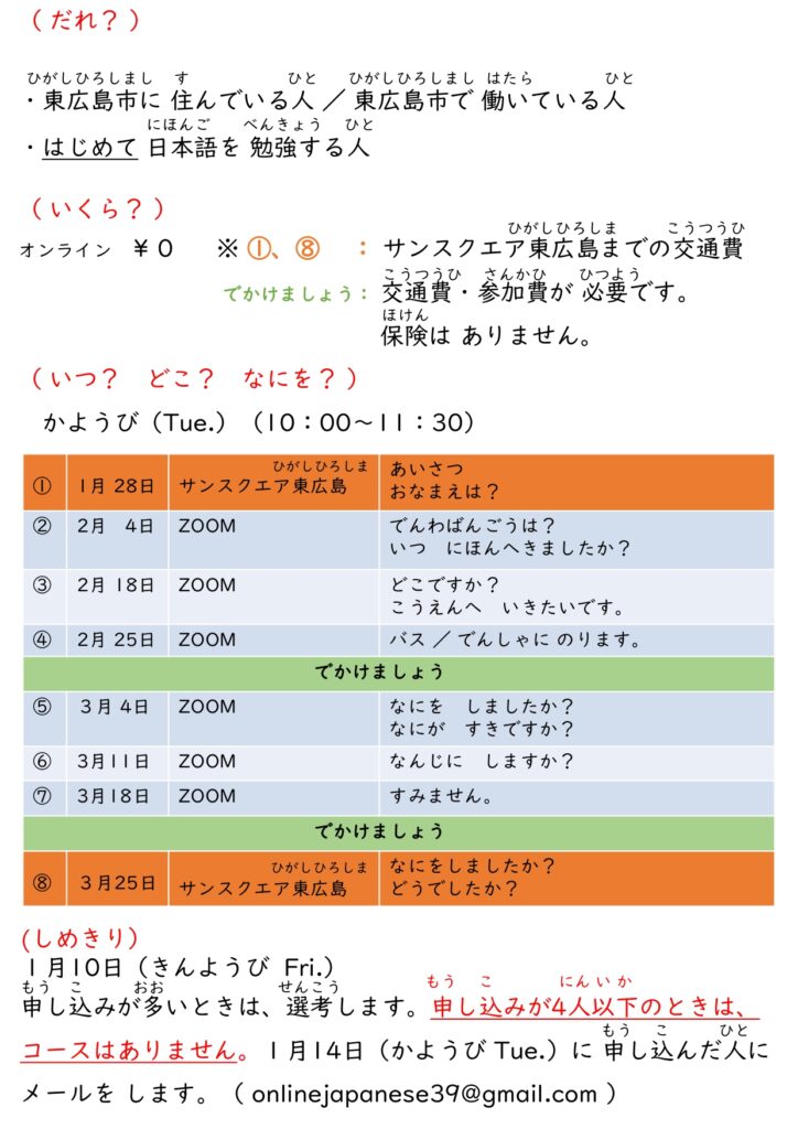 初心者(しょしんしゃ)のための「地域(ちいき)とつながるオンライン日本語(にほんご)コース」 が始(はじ)まります。締切(しめきり)は 2025年1月10日。