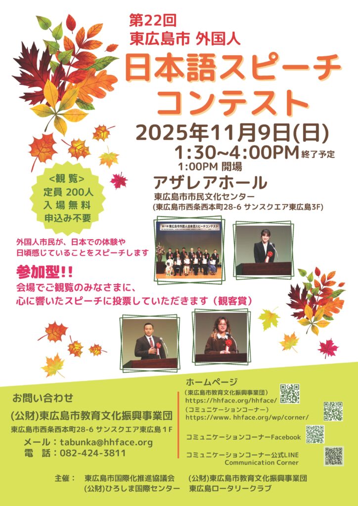 This event will take place in Azalea Hall on Sunday, November 9th. If you are a non-Japanese resident, and you live, work or study in Higashihiroshima-city, how about taking part? The application is being accepted till, October 10th. See the flyers for an overview of the contest and how to apply.