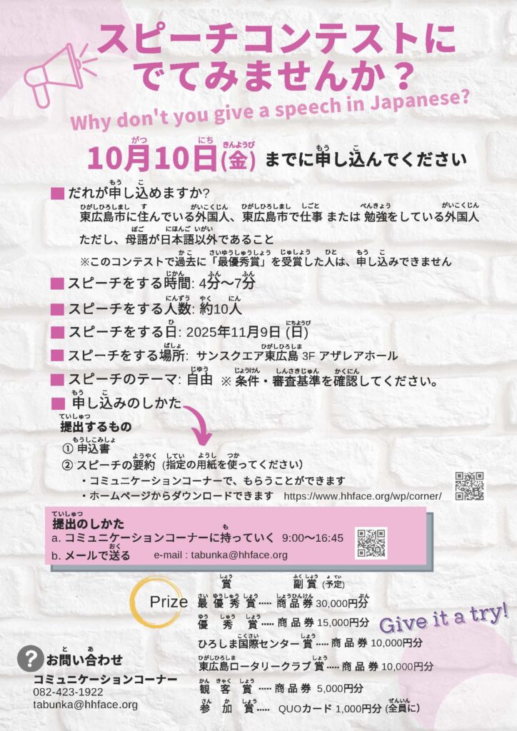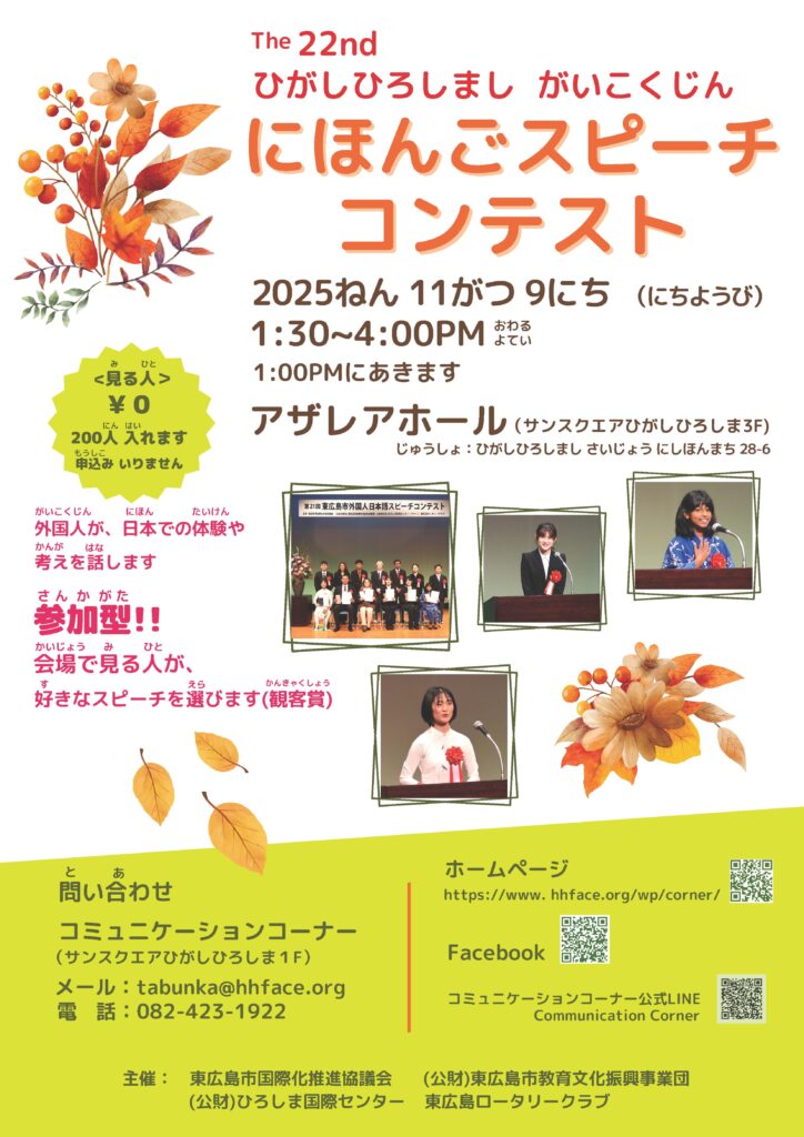This event will take place in Azalea Hall on Sunday, November 9th. If you are a non-Japanese resident, and you live, work or study in Higashihiroshima-city, how about taking part? The application is being accepted till, October 10th. See the flyers for an overview of the contest and how to apply.