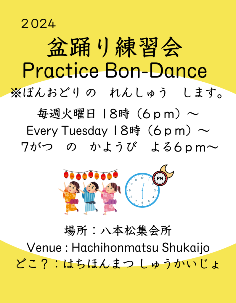 每周星期二晚上18:00~,在八本松集会所将举办盂兰盆舞练习会。任何人都可以参加,并且免费。请查看下面的地图了解具体地点。