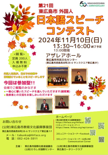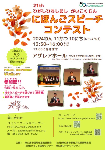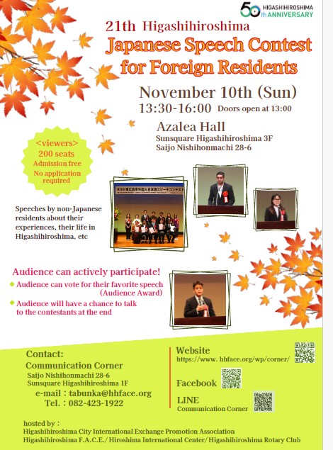 On 10 November (Sunday), from 13:30 to 16:00, a Japanese speech contest will be held at Azalea Hall on the 3rd floor of Sunsquare Higashihiroshima.