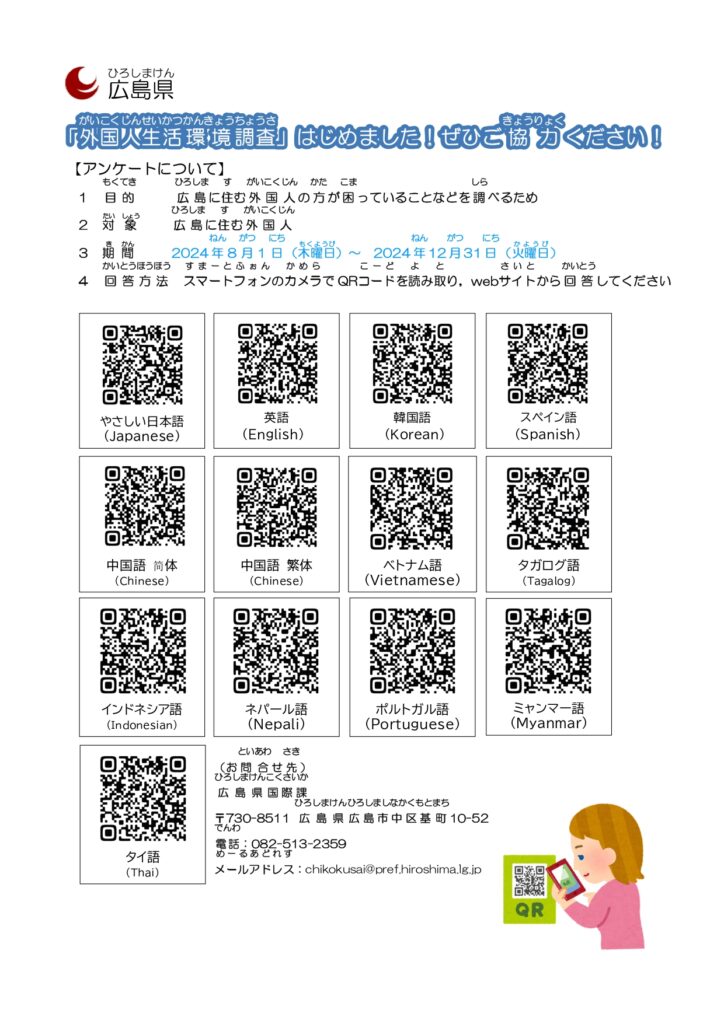 Xin vui lòng dành chút thời gian để trả lời các câu hỏi trong bảng khảo sát dành cho cư dân người nước ngoài hiện đang sinh sống tại tỉnh Hiroshima. Có thể trả lời một cách đơn giản vì vậy mong nhận được sự hợp tác từ quý cư dân. Hạn chót là ngày 31/12.