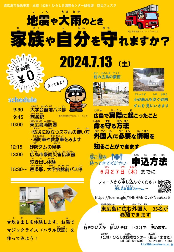 7月13日(土:どようび)9:30~15:30、防災(ぼうさい)フェスタがあります。バスツアーです。東広島市(ひがしひろしまし)の外国人(がいこくじん)が参加(さんか)できます。無料(むりょう)です。もっと知(し)りたい人(ひと)はチラシを見(み)てください。